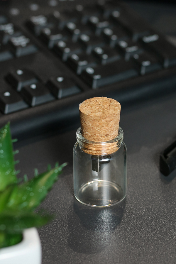 Флешка в виде стеклянной банки с пробкой. На корпус можно нанести УФ печать или гравировку.