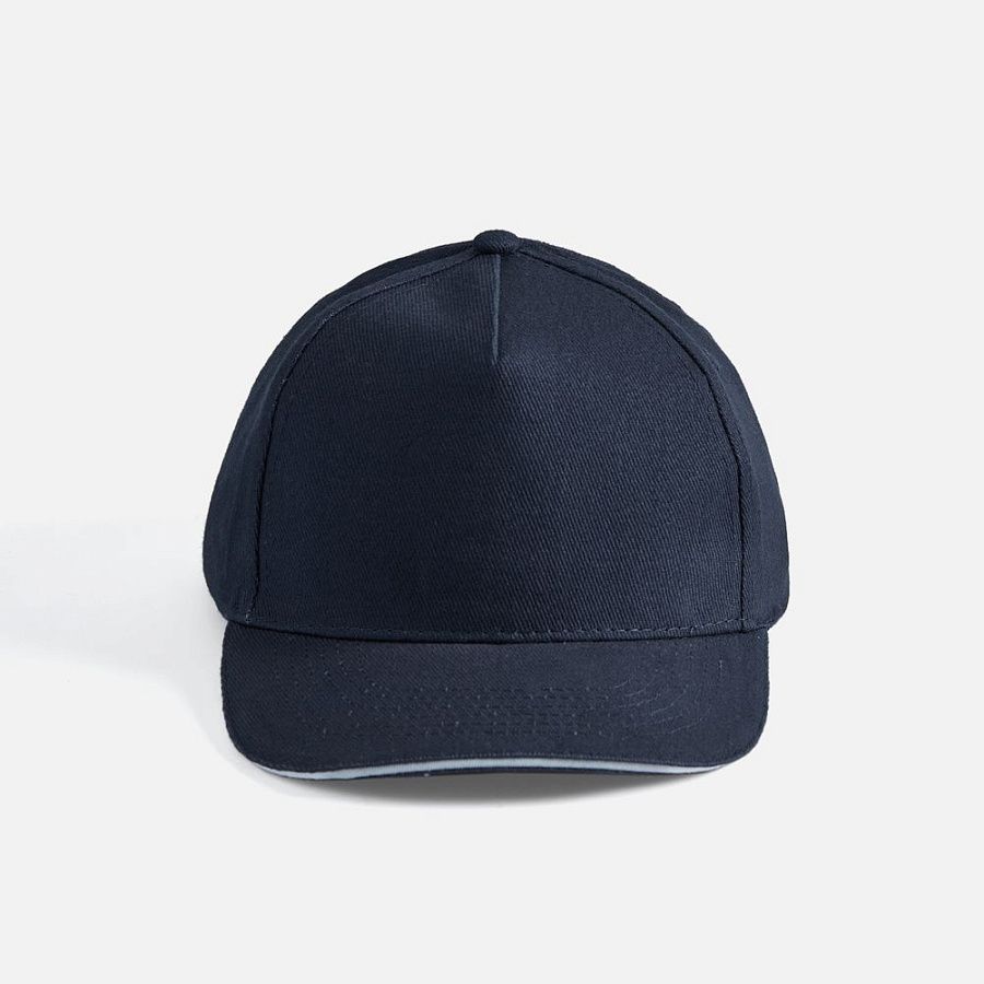 Модель бейсболки с 5-ю клиньями без лобового шва из плотного чесаного хлопка.