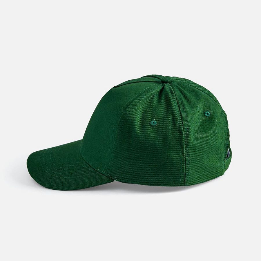 Модель бейсболки с 5-ю клиньями без лобового шва из плотного чесаного хлопка.