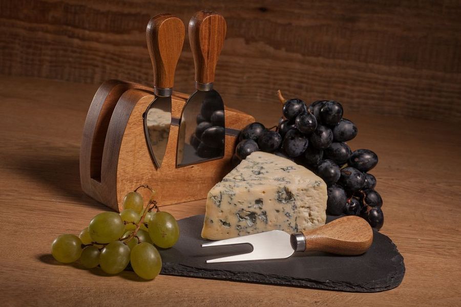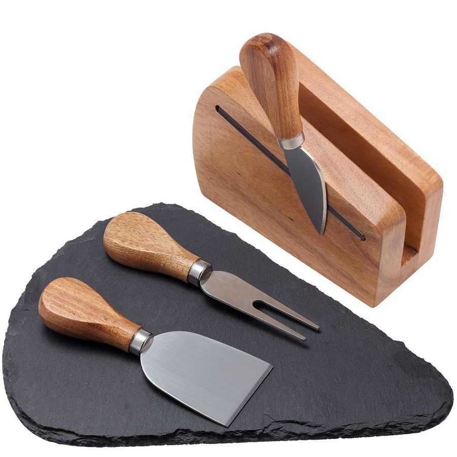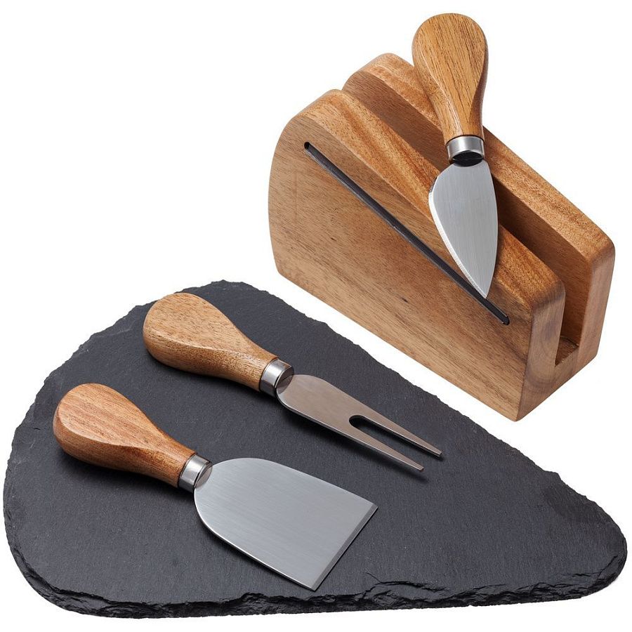 Подставка и рукоятки ножей выполнены из дерева акации, лезвия — из высококачественной нержавеющей стали.
