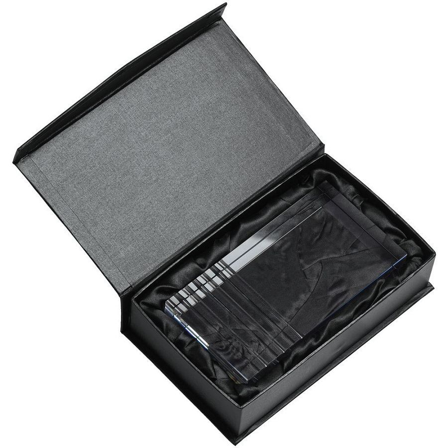 Стела изготовлена из стекла К9, в основе которого лежит оптическое боросиликатное стекло. Эту марку стекла отличает низкий процент посторонних включений, высокий показатель преломления и высокая прозрачность — идеальные качества для изготовления наград премиального уровня.
