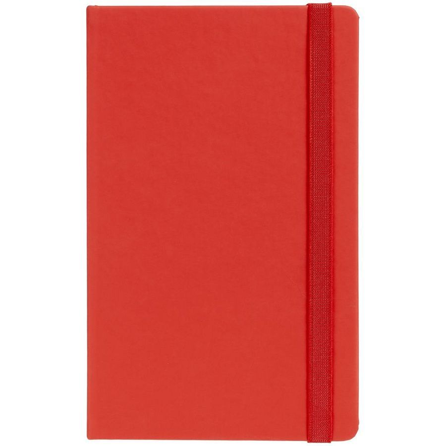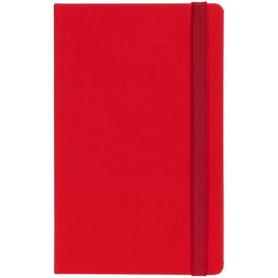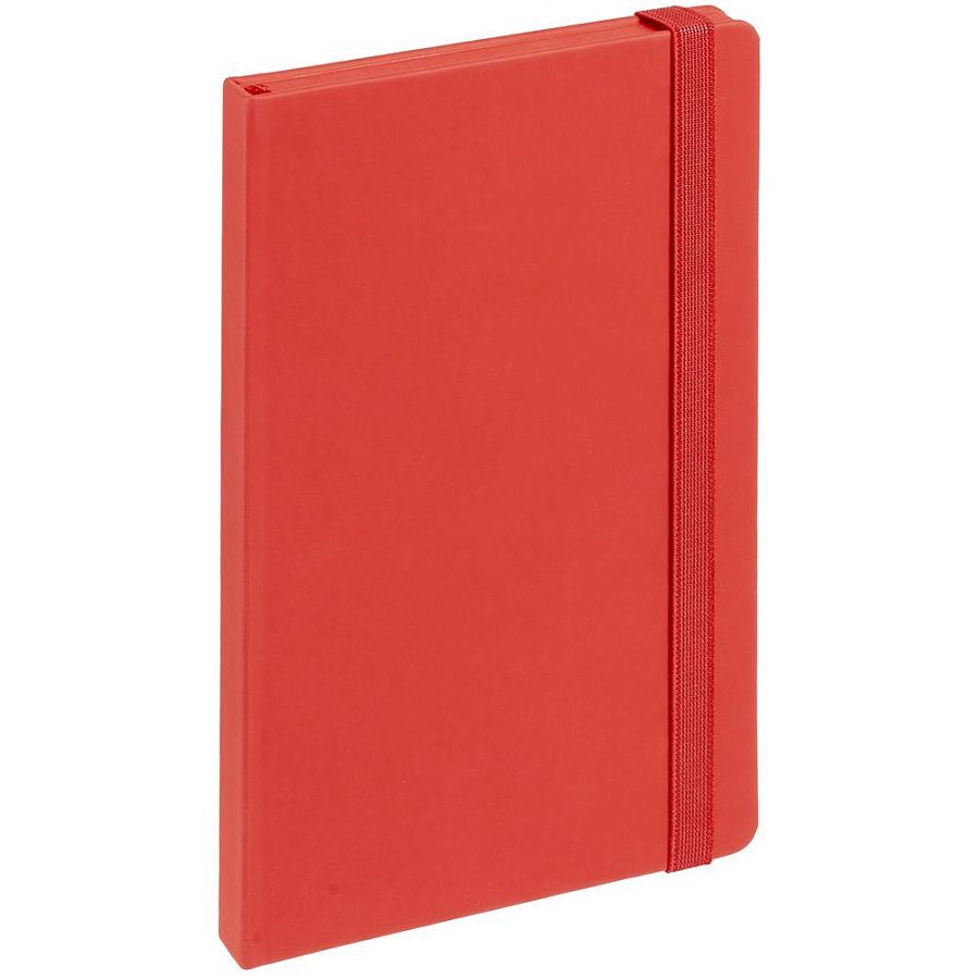 Блокнот в твердой обложке, выполнен из материала Soft Touch Ultra, красный РР, дополнен резинкой и ляссе в цвет обложки.