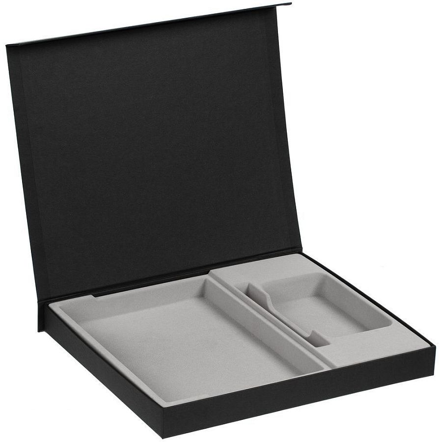 Коробка из переплетного картона, кашированного фактурной дизайнерской бумагой Efalin, с крышкой на магните и флокированным ложементом.
