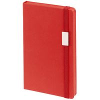 Блокнот в твердой обложке, выполнен из материала Soft Touch Ultra, красный РР, дополнен резинкой и ляссе в цвет обложки.