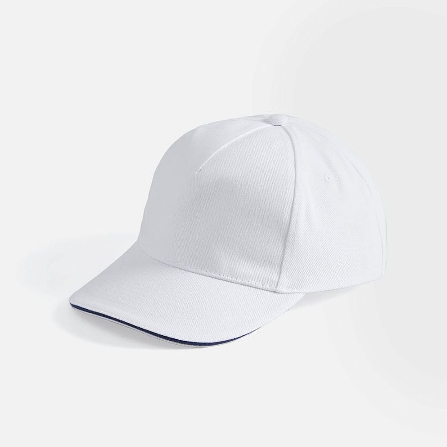 Модель бейсболки с 5-ю клиньями без лобового шва из плотного чесаного хлопка.