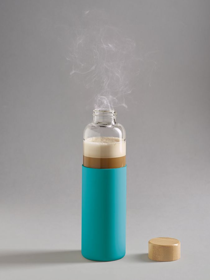 Бутылка со стеклянной колбой и крышкой из бамбука — изящное решение для тех, кто предпочитает природные материалы. Яркий силиконовый чехол защищает колбу от повреждений.