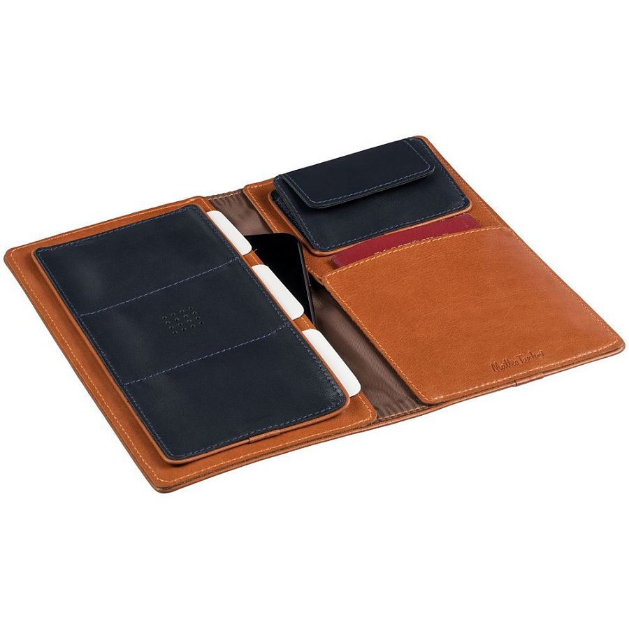 Чтобы передать этот удивительный контраст, для изделий Kalsa Palermo была выбрана гладкая натуральная кожа: глубокого синего цвета снаружи и светло-коричневого оттенка внутри. Оформленные в едином стиле, они легко собираются в подарочные наборы.