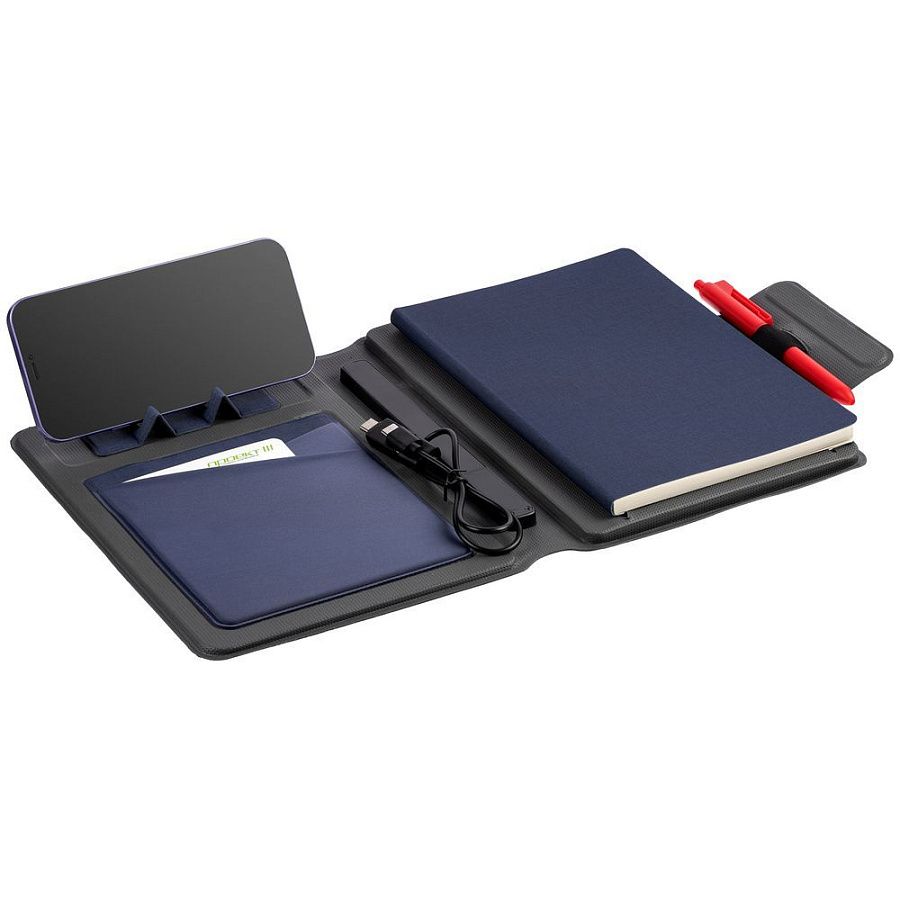 Органайзер с блокнотом и аккумулятором с беспроводной зарядкой. Обложка с фактурой, имитирующей ткань, на магнитной застежке.