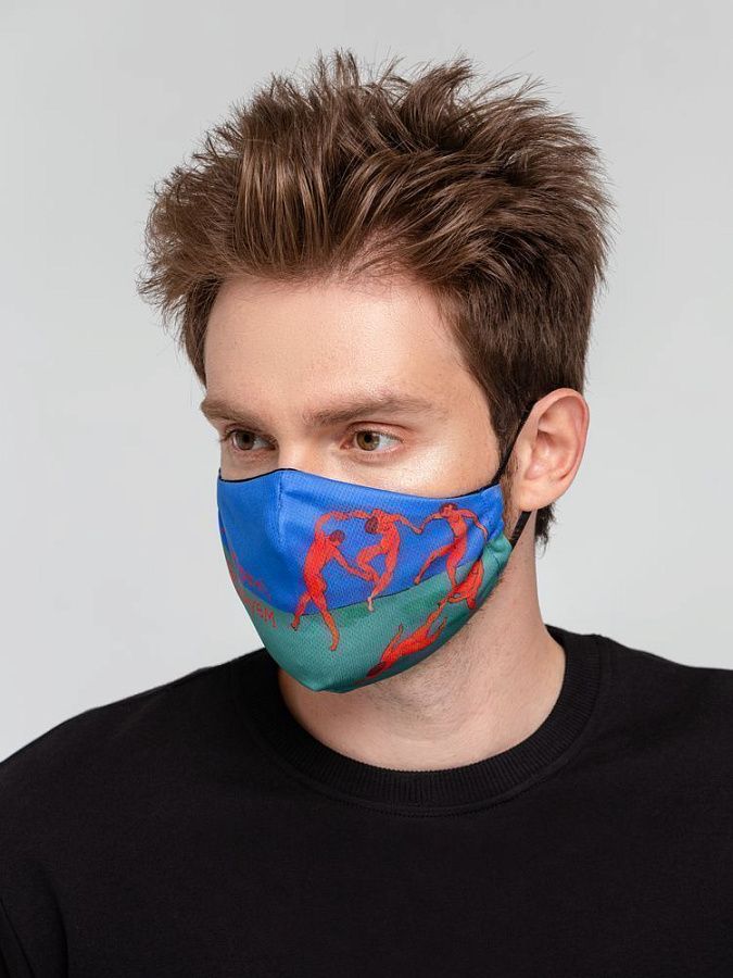 Принт создан по мотивам знаменитой картины Анри Матисса «Танец».Многоразовая маска из дышащей ложной сетки с ярким принтом с гигиенической хлопковой подкладкой и заушниками-резинками.