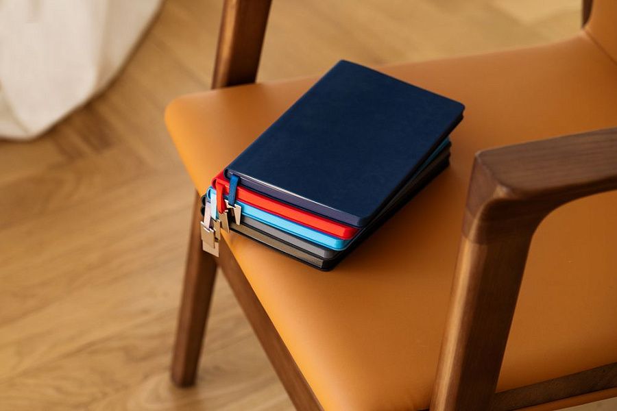 Ежедневник с гибкой обложкой, выполнен из материалов Soft Touch Pearl, серый СС, и Latte, серый (внутренняя часть обложки), дополнен ляссе в цвет обложки с металлическим шильдиком.