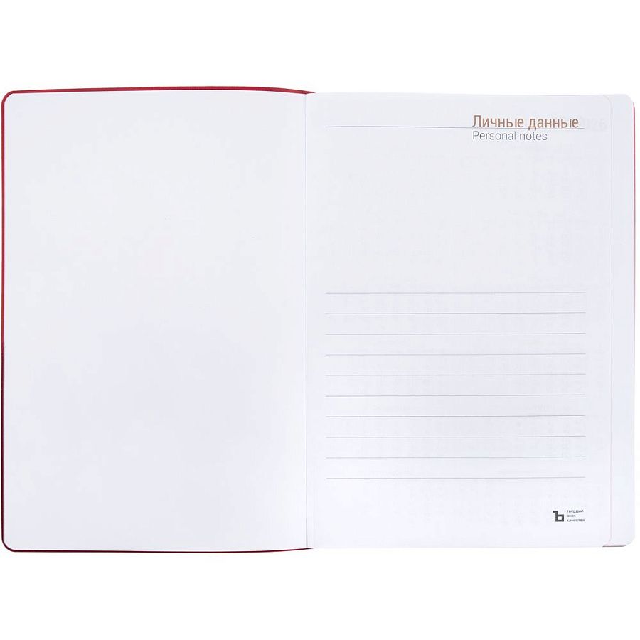Гибкая обложка ежедневника выполнена из материала Latte, красный РР. Внутри корешка — специальное место для крепления ручки размером до 15х0,9 см.