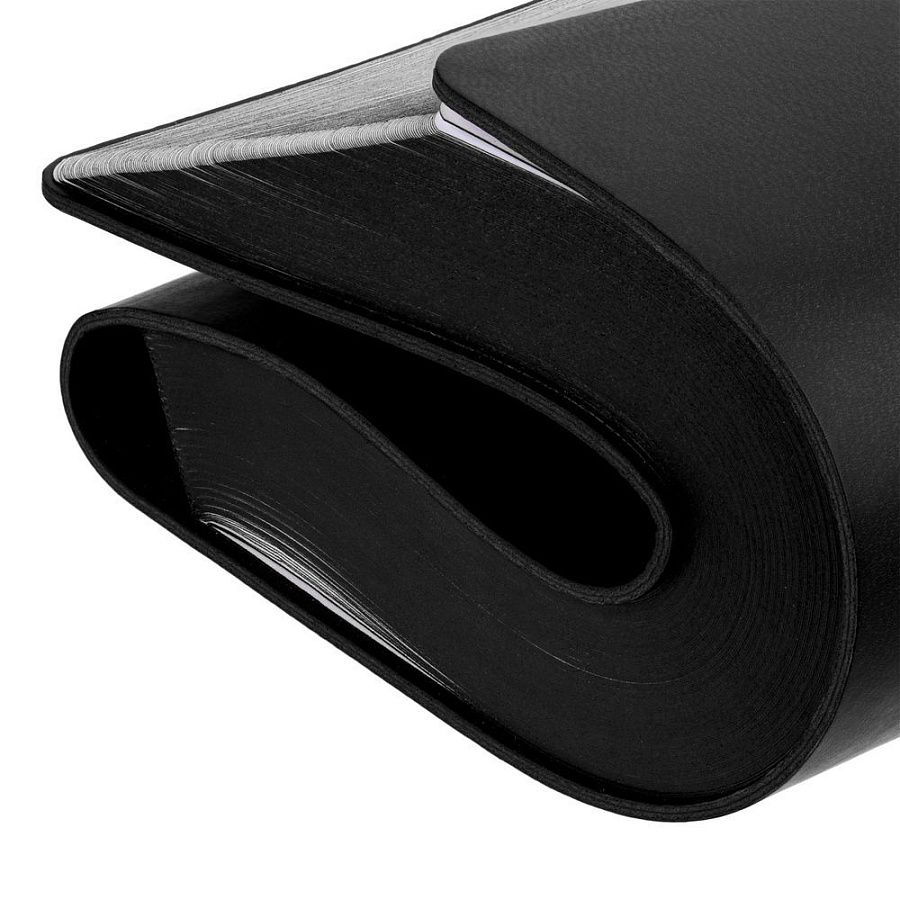 Гибкая обложка ежедневника выполнена из материала Latte, черный АА. Внутри корешка — специальное место для крепления ручки размером до 15х0,9 см.