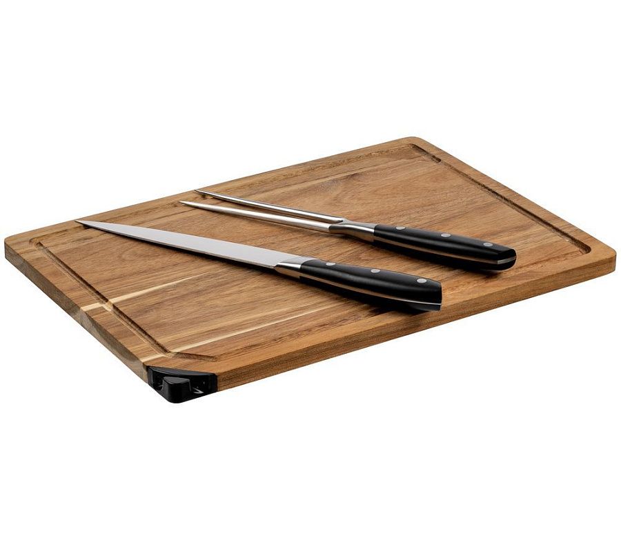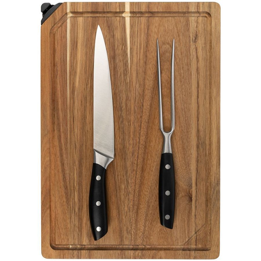 Доска с желобком, нож-слайсер для нарезки ломтиками и разделочная вилка — отличный подарок для человека, любящего готовить и красиво подавать на стол мясо, птицу или рыбу.
