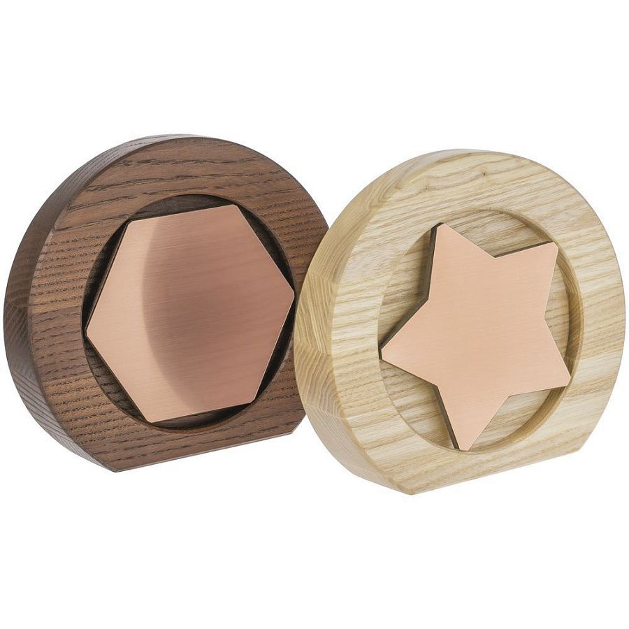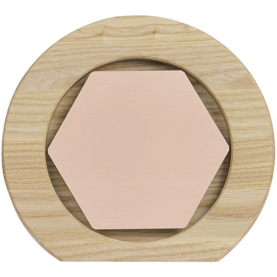 Вставка с шестигранником из зеркального пластика на деревянной основе крепится на приподнятое основание внутри стелы, что создает объем и многослойность награды. На вставке предусмотрен клеевой слой для крепления после нанесения.