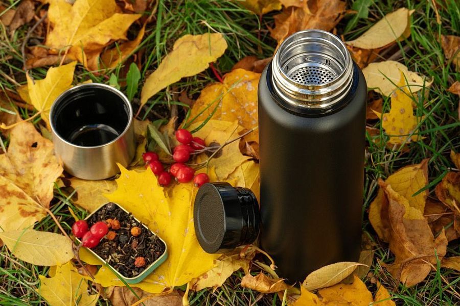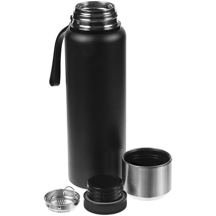 Термос в строгом металлическом корпусе с вакуумной изоляцией. Завинчивающаяся пробка, крышка-чашка и ситечко для фильтрации — удобно заваривать чай или кофе. Напиток останется горячим, а чаинки не попадут в чашку.