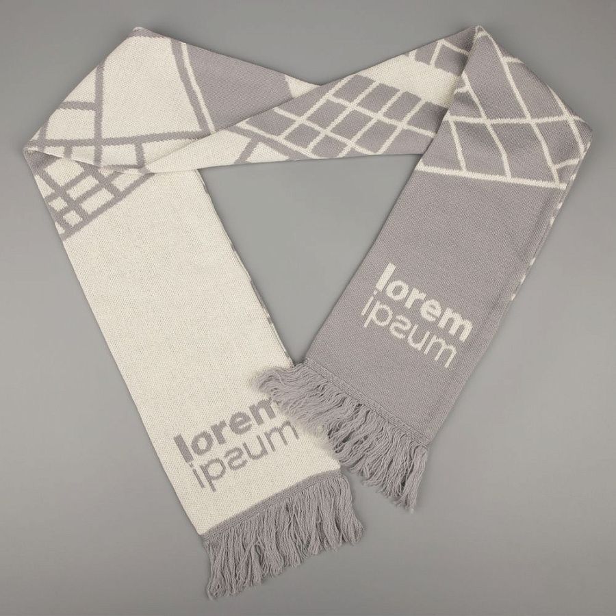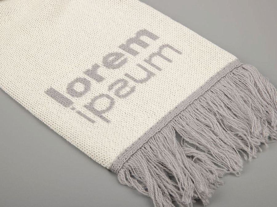 Шарф с вывязанным логотипом и индивидуальным рисунком в фирменной цветовой гамме.