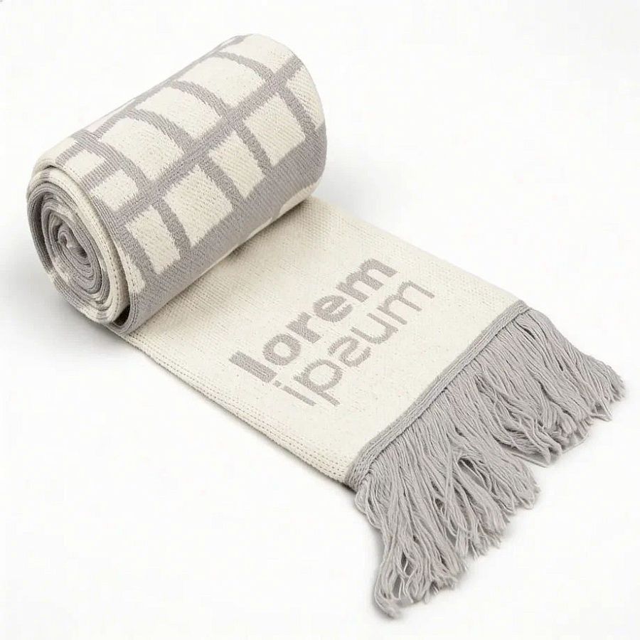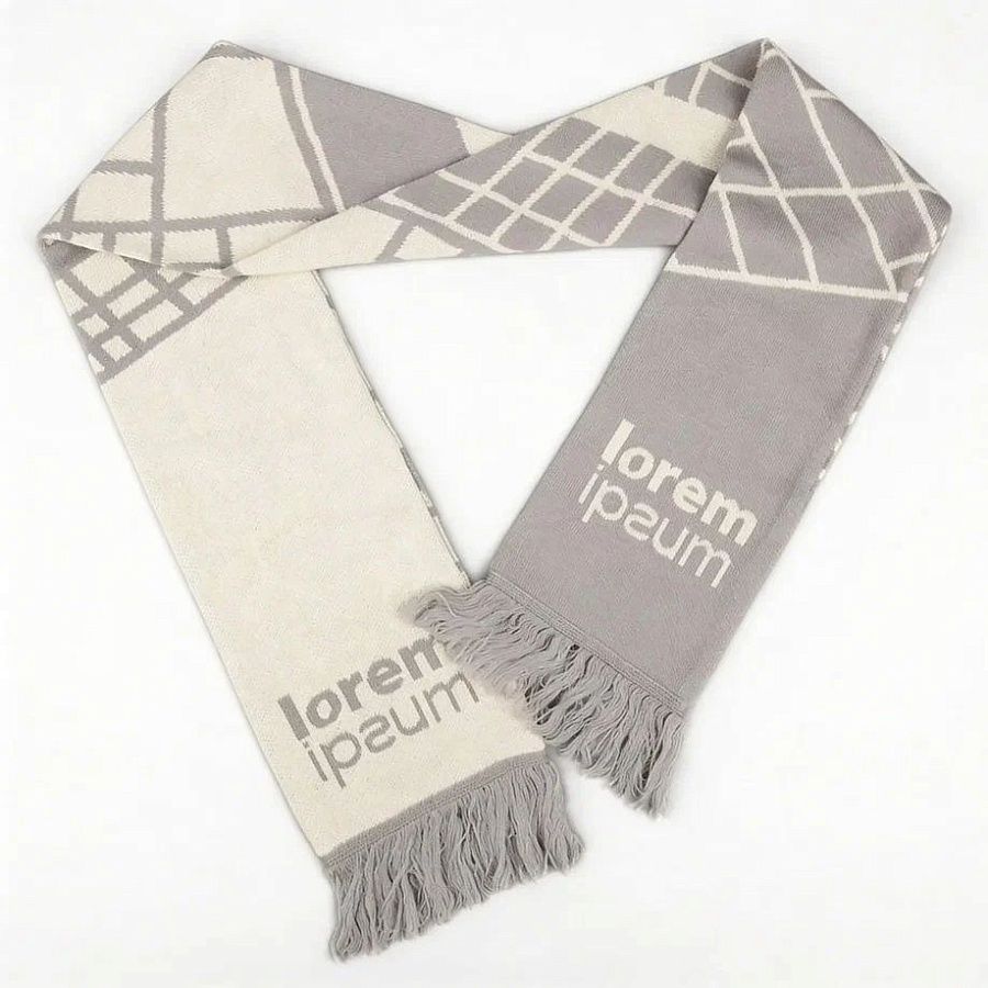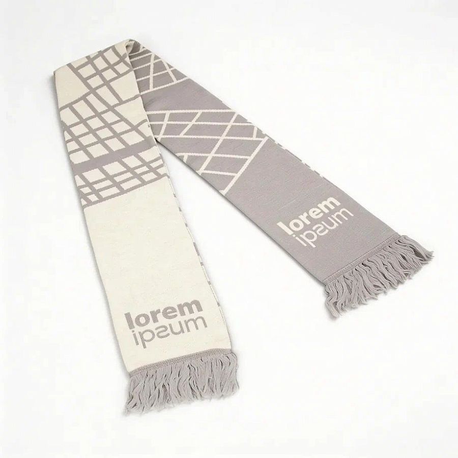 Шарф с вывязанным логотипом и индивидуальным рисунком в фирменной цветовой гамме.