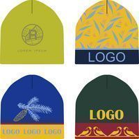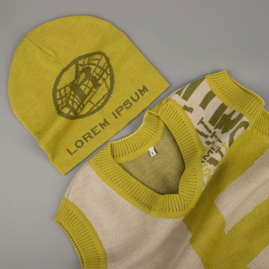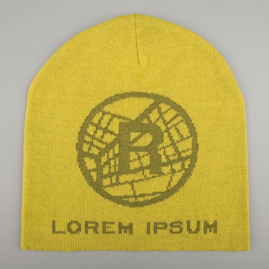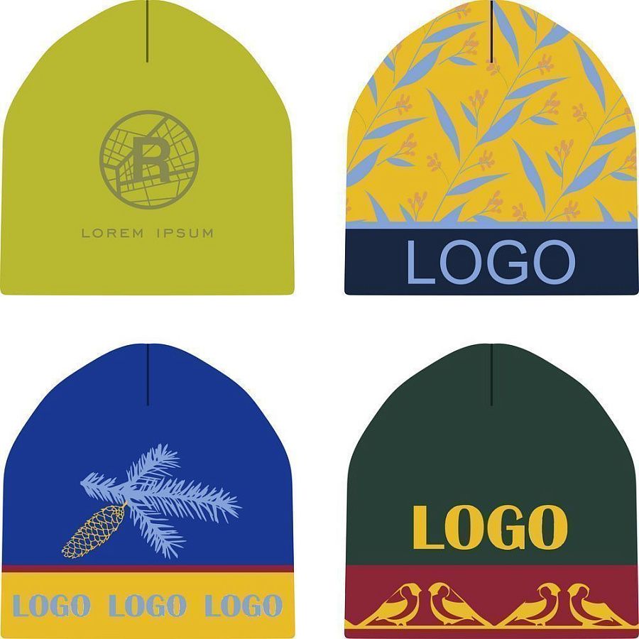 Шапка с вывязанным логотипом и индивидуальным рисунком в фирменной цветовой гамме.