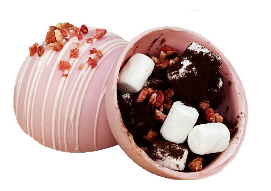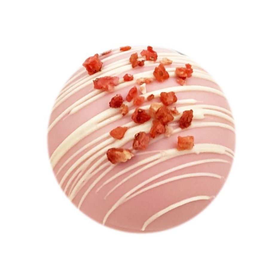 Состав: сфера из клубничного шоколада, какао алкализованный, маршмеллоу, сублимированная клубника.