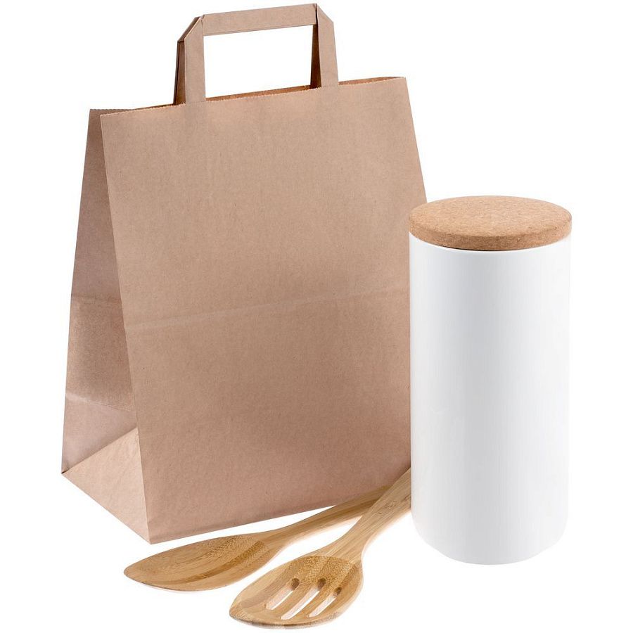 набор лопаток - бамбук; банка - фарфор, пробка; пакет - бумага