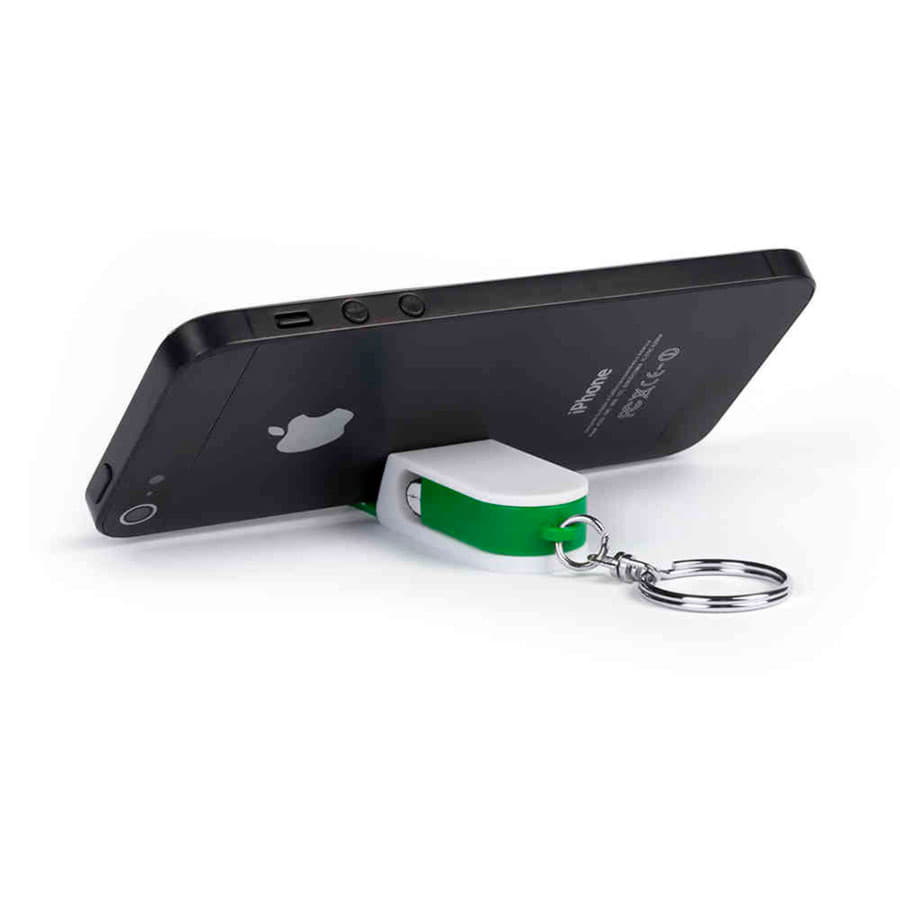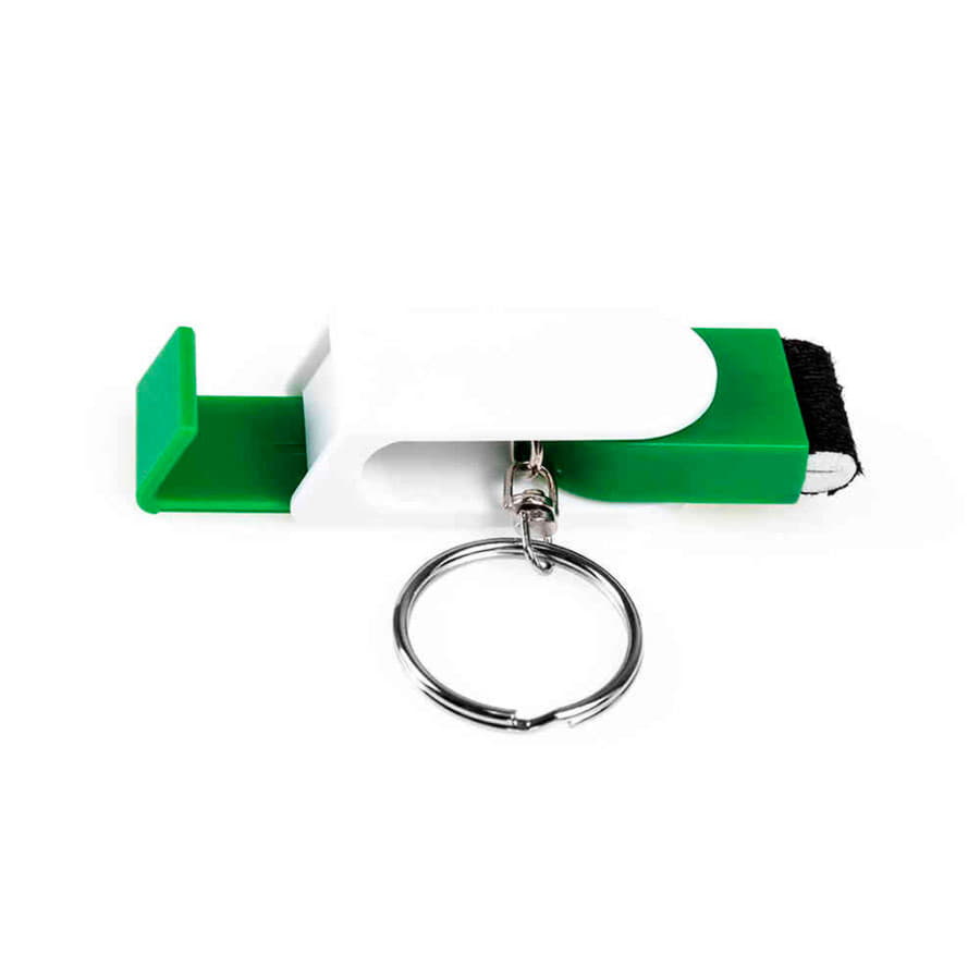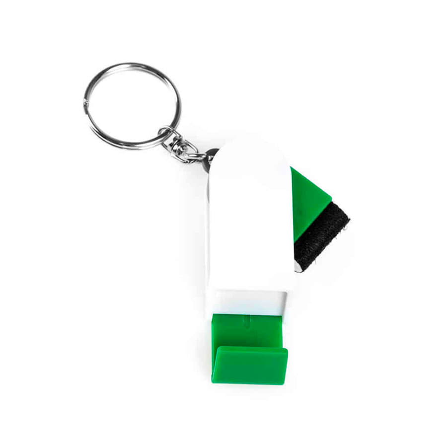 Пластиковый брелок с держателем для телефона и валиком для протирания экрана.
