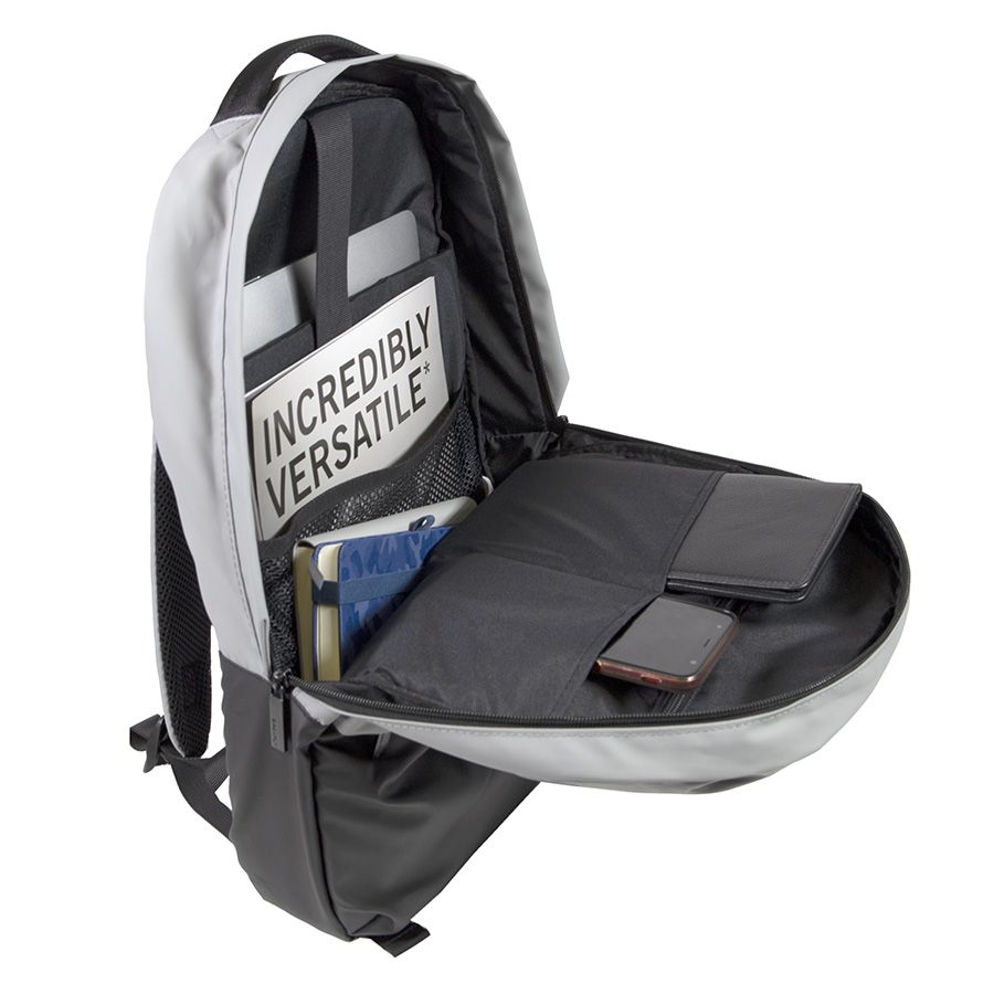Основной цвет: близкий к Pantone 423 C, нижняя часть: цвет, близкий к Pantone 426 C · Основная ткань: 100% полиэстер c PU покрытием, подкладка: 100% полиэстер · Объём: 13 литров · Вмещает ноутбук 15,6" Описание: · Прочный и водоотталкивающий материал Anti-scratch · Основной отдел на молнии с двумя бегунками и планкой, защищающей от попадания влаги внутрь · Внешний удобный карман -органайзер на молнии · Внутри укрепленный отдел для ноутбука с защитной тесьмой на липучке · Дополнительные карманы для хранения документов · Эргономичные лямки · Укрепленная ручка рюкзака · Лямки прошиты дополнительными стропами в быстро изнашиваемых местах, которые можно отрегулировать по длине и зафиксировать пластиковыми крепежами · Брендированные металлические пуллеры Bag Fly · Жаккардовый логотип Bag Fly внутри · Картонный ярлык Bag Fly · Упаковка: прозрачный пакет