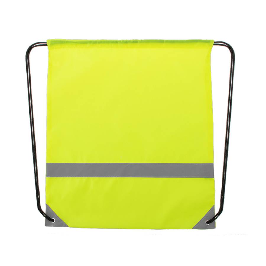 Рюкзак из мягкого полиэстера 190T со светоотражающей полосой спереди. Самозакрывающиеся черные завязки и светоотражающие уголки, усиленные металлическими кольцами.