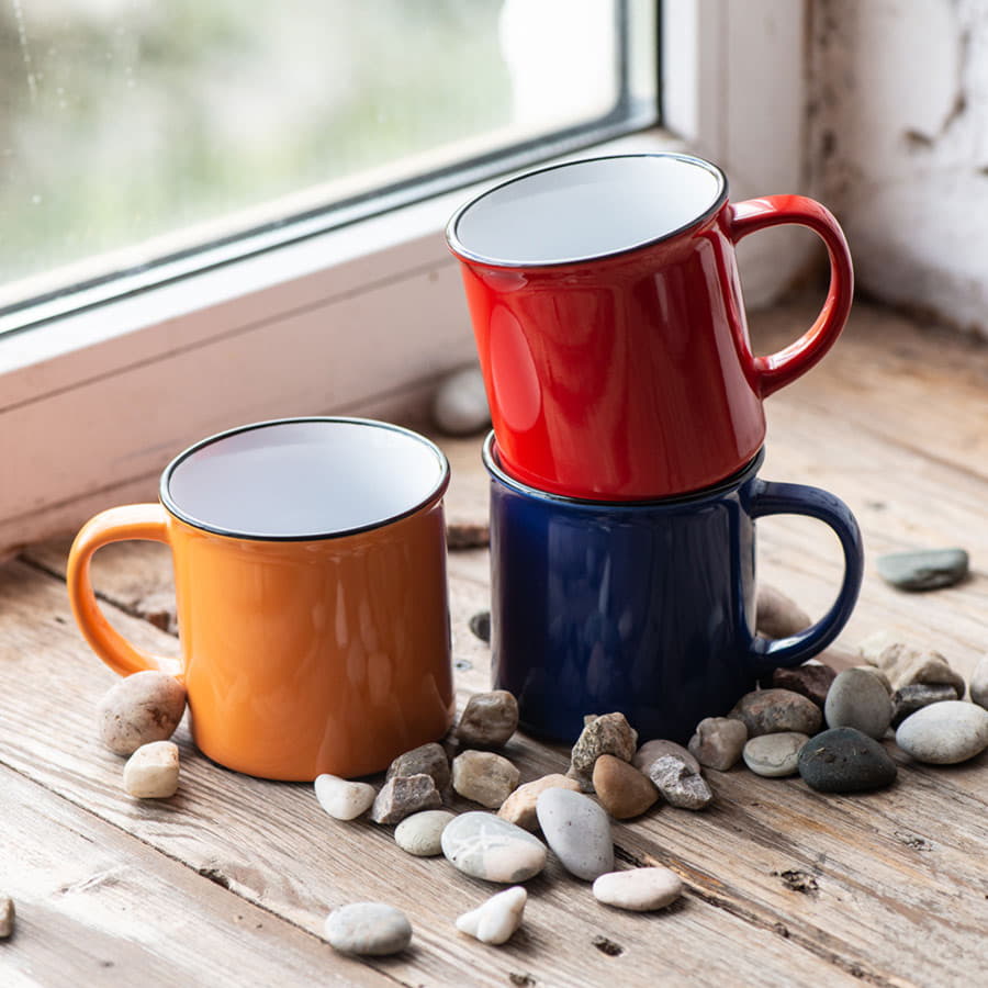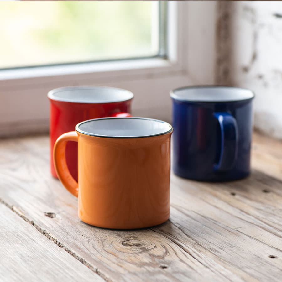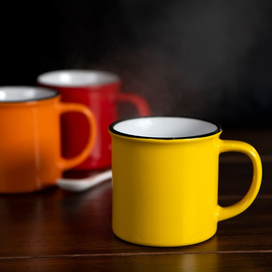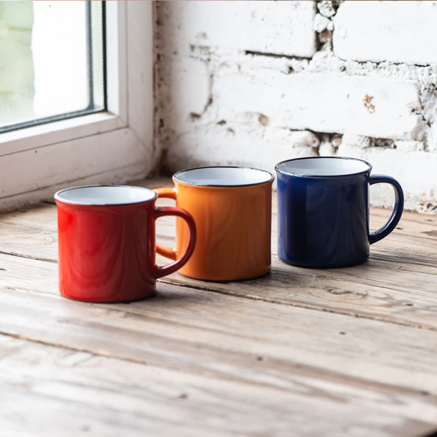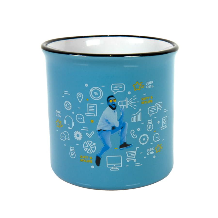 Кружка всем знакомой формы из советского прошлого. Она прочно обосновалась как в рознице, так и на рынке бизнес сувениров. Это своего рода ретро маркетинг, когда продукт имеет эмоциональную ностальгическую привязку к прошлому, к чему то родом из детства. Яркие цвета, черный кант Цвет близкий к Pantone 298C