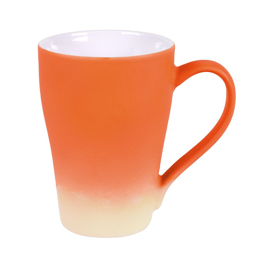Кружка с прорезиненным покрытием и цветовым градиентом Переход от насыщенного оттенка в основной части кружки к совсем светлому внизу, для более выгодного представления логотипа на темной части Градиент - модный тренд, для его создания используются различные техники, краски и материалы, берутся различные цветовые сочетания Природа - главный творец градиента. Небо, море, бесконечные пески пустыни или горные вершины в снегу... Самые красивые и самые естественные цветовые сочетания - вокруг нас. Цвет темной части близкий к Pantone 165CНе рекомендуется мыть в посудомоечной машине** Перед оформлением заказа рекомендуем ознакомиться с образцом ввиду особенностей прорезиненного покрытия, связанных с производством.