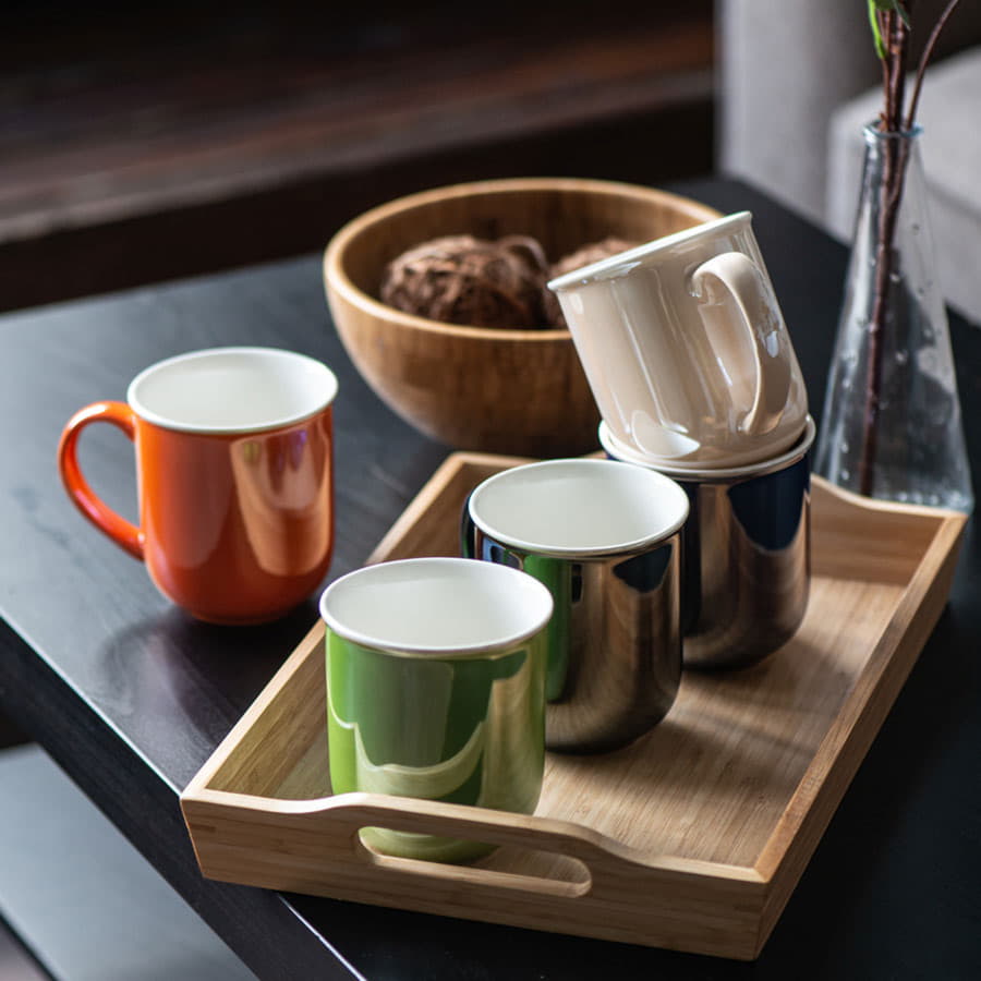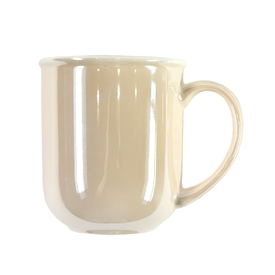 Кружка необычной, скругленной внизу формы, дополнена белым кантом по верхнему краю и актуальным покрытием с жемчужным блеском или эффектом перламутра. Переливчатость цвета создается благодаря особой структуре покрытия, которая по-разному преломляет солнечные лучи. Цвет близкий к Pantone Pearled Ivory