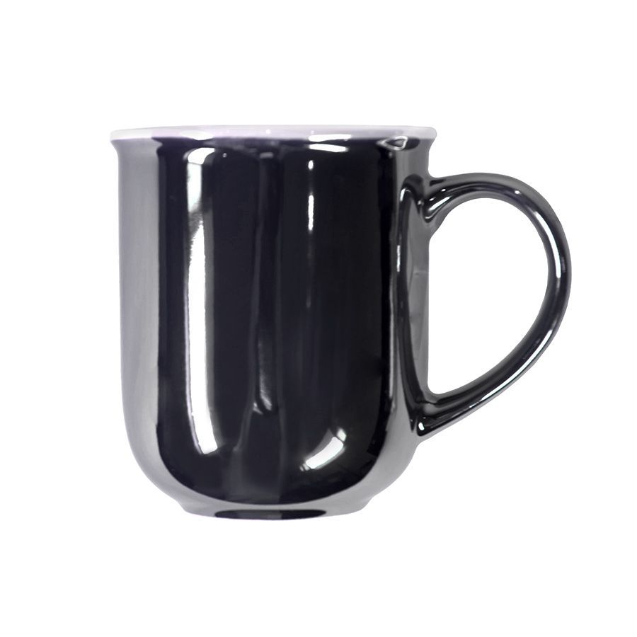 Кружка необычной, скругленной внизу формы, дополнена белым кантом по верхнему краю и актуальным покрытием с жемчужным блеском или эффектом перламутра. Переливчатость цвета создается благодаря особой структуре покрытия, которая по-разному преломляет солнечные лучи.