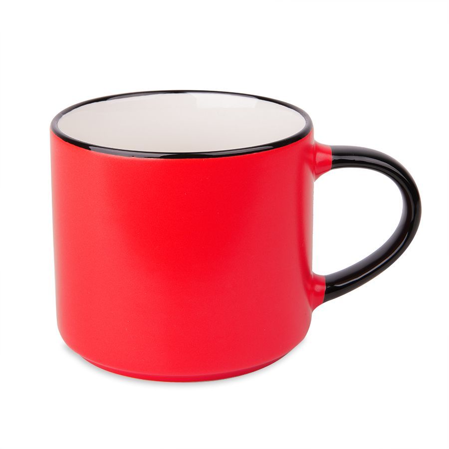 Ёмкая кружка трендовой цилиндрической формы с матовым покрытием.Яркий цветной корпус с черной ручкой и кантом по краю.Цвет близкий к Pantone 199C