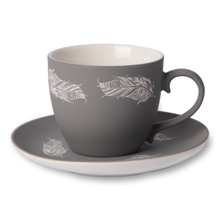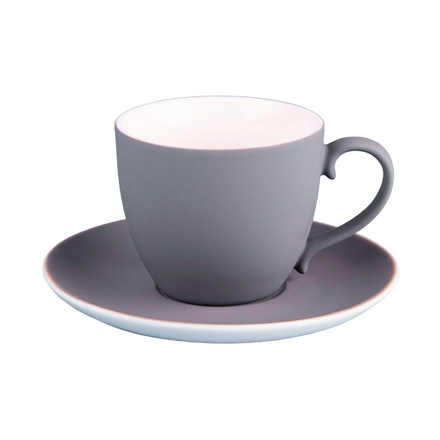 Чайная пара из фарфора с прорезиненным покрытием soft-touchЧашка классической формы и удобное глубокое блюдцеЦвет близкий к Pantone 2333CНе рекомендуется мыть в посудомоечной машине