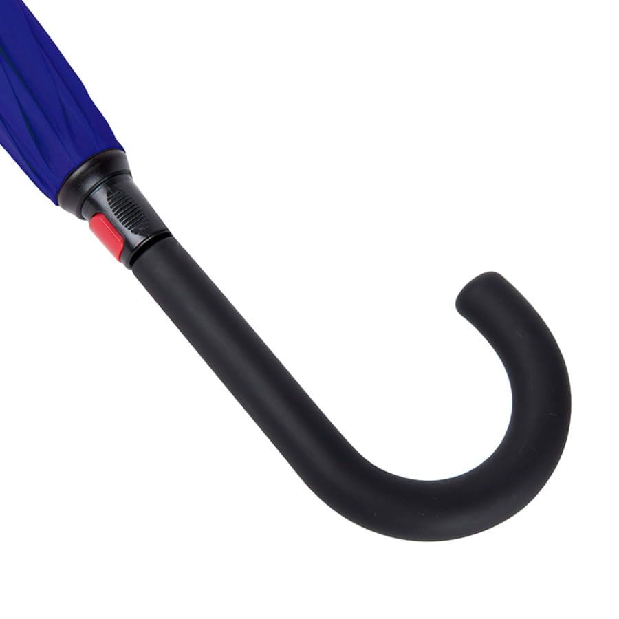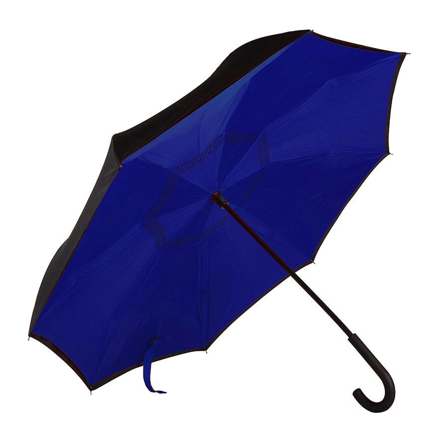 Зонт-трость, механический.Диаметр купола: 106 см., длина стержня 77 см.Состав купола: 100% полиэстер 190T.Состав стержня: металл.Состав спиц: стекловолокно.Ручка: пластик с покрытием soft-touch. Цвет купола: внешняя часть чёрная, внутренняя часть синего цвета близкого к пантону 2757 С.