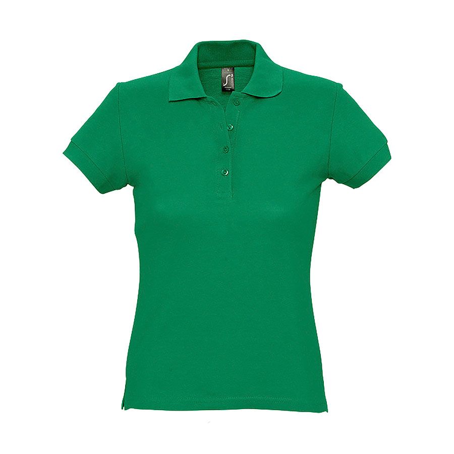 Приталенное женское поло.Прямой низ, боковые разрезы. Рукав короткий.Воротник и манжеты из эластичной резинки-рибаны.Ворот укреплен тесьмой.4 пуговицы в тон изделия на планке.Запасная пуговица на внутреннем боковом шве.Цвет близкий к PANTONE 348C