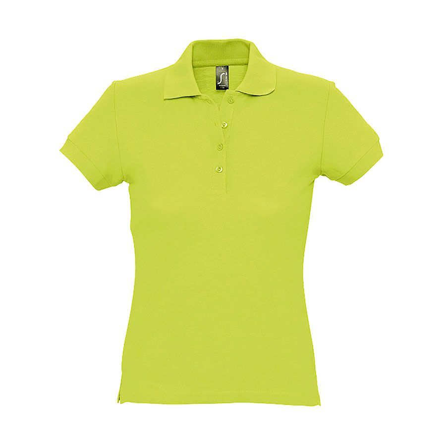Приталенное женское поло.Прямой низ, боковые разрезы. Рукав короткий.Воротник и манжеты из эластичной резинки-рибаны.Ворот укреплен тесьмой.4 пуговицы в тон изделия на планке.Запасная пуговица на внутреннем боковом шве.Цвет близкий к PANTONE 374C