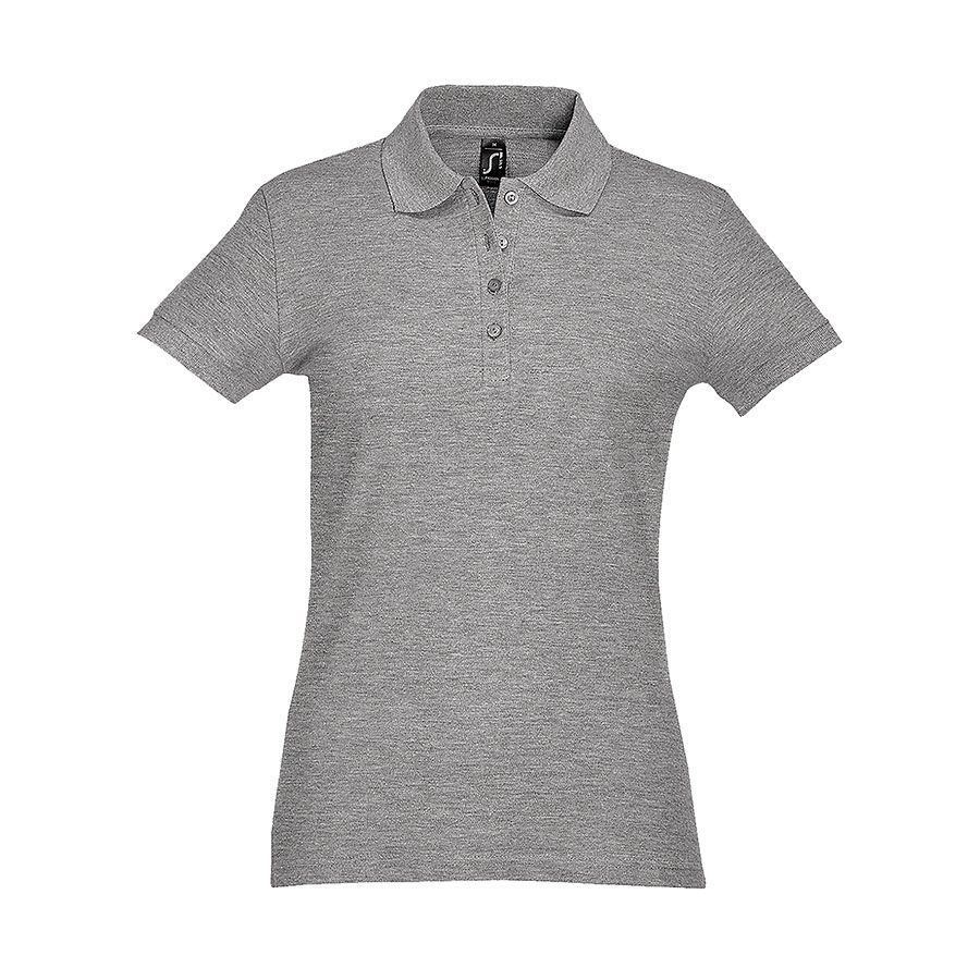 Приталенное женское поло.Прямой низ, боковые разрезы. Рукав короткий.Воротник и манжеты из эластичной резинки-рибаны.Ворот укреплен тесьмой.4 пуговицы в тон изделия на планке.Запасная пуговица на внутреннем боковом шве.Цвет близкий к PANTONE 423С