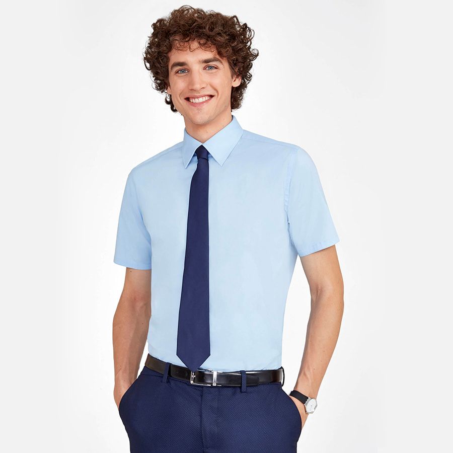 Мужская рубашка с коротким рукавом из ткани стрейч. Итальянский полуоткрытый воротник с 1 пуговицей. Облегающий крой, планка на 7 пуговиц в тон изделия.