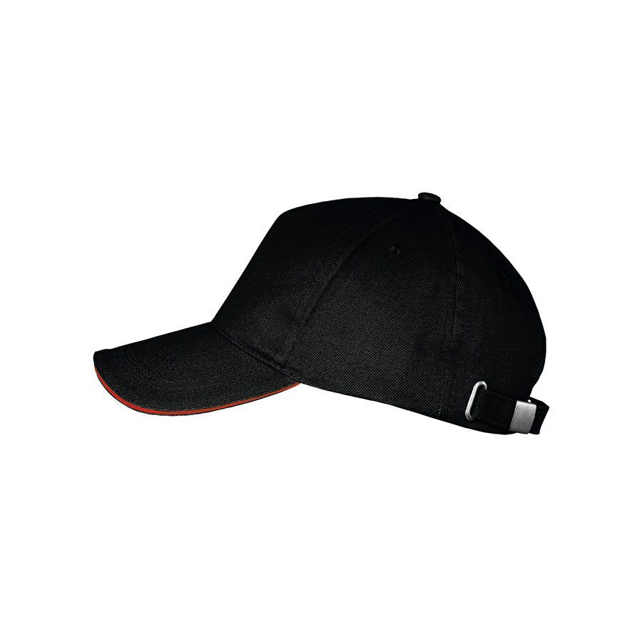 Бейсболка LONG BEACH без лобового шва с жестким козырьком "сэндвич". 4 вышитых люверса, регулируемая металлическая застежка. Цвет (чёрный), близкий к PANTONE 426C Цвет (красный), близкий к PANTONE 200C58 см - минимальный размер, с помощью застёжки его можно увеличить до необходимого.