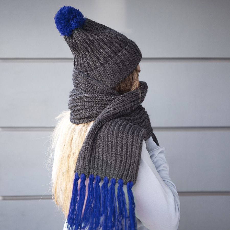 Мягкий, пушистый и уютный комплект из шарфа и шапки поможет согреться вам в холодное время года. Стильный меланжевый темно-серый цвет в средневековой Франции означал огромную власть. В те времена вся знать в основном одевалась в графитовые тона. Недаром, родилось выражение «серый кардинал». Почувствуйте магическое влияние серого цвета в сочетании с яркой отделкой!Цвет помпона и кисточек близкий к Pantone 287C