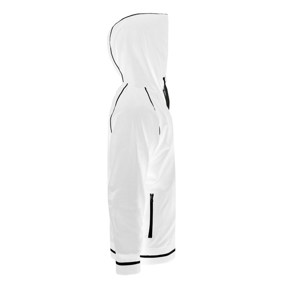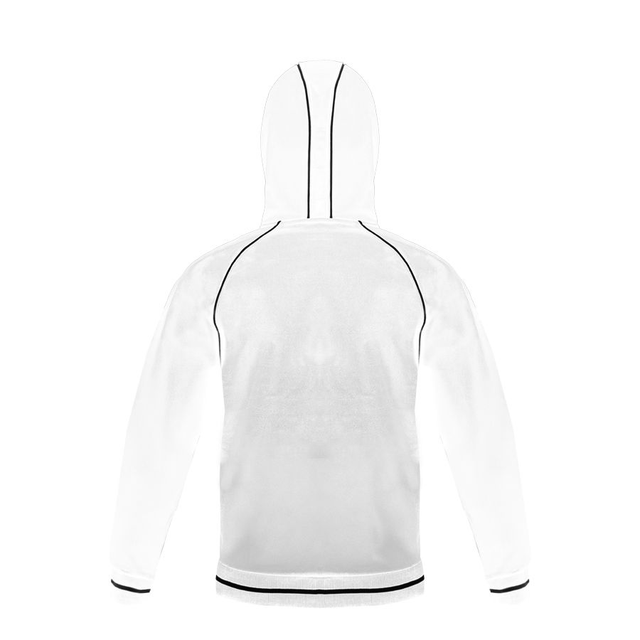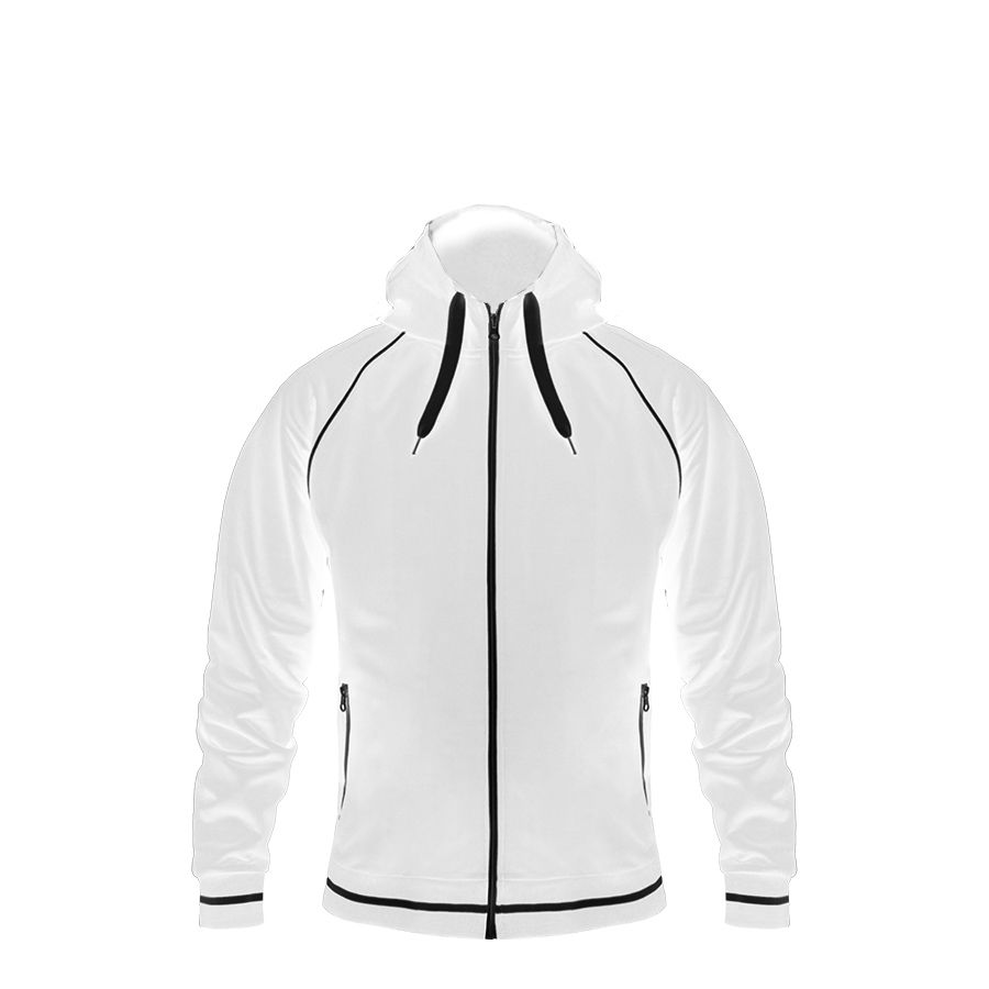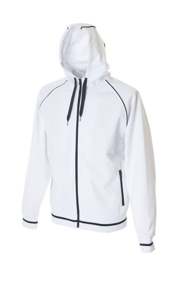 Основная ткань: цвет, близкий к Pantone Standart white Толстовка из полотна "пике" с водоотталкивающей пропиткой. Обратные контрастные молнии для предотвращения попадания влаги внутрь. Рукава-реглан. Декоративная тесьма по горловине спинки. Капюшон на подкладке с небольшой стойкой. Контрастные канты и шнур в капюшоне. Два передних кармана на молнии. Манжеты и низ изделия обработаны плотным рибом 1*1 .