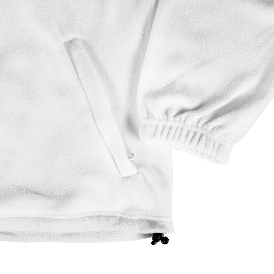 Основная ткань: цвет, близкий к Pantone Standart white Утепленная толстовка повышенной плотности. Удобный воротник-стойка на молнии. Светоотражающий съемный пуллер с символикой JRC. Два кармана на молнии. Утягивающий шнурок по низу изделия. Эластичные резинки по низу рукавов.