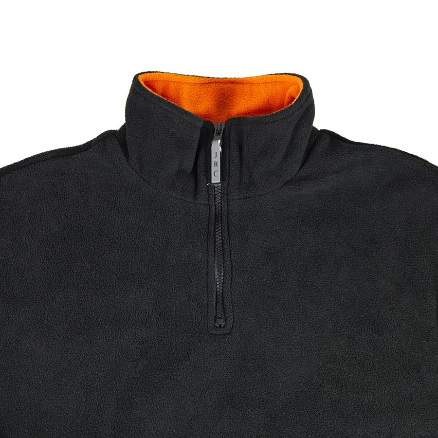 Основная ткань: цвет, близкий к Pantone Black C, воротник: цвет, близкий к Pantone 1585 C Утепленная толстовка повышенной плотности. Удобный воротник-стойка на молнии. Светоотражающий съемный пуллер с символикой JRC. Два кармана на молнии. Утягивающий шнурок по низу изделия. Эластичные резинки по низу рукавов.