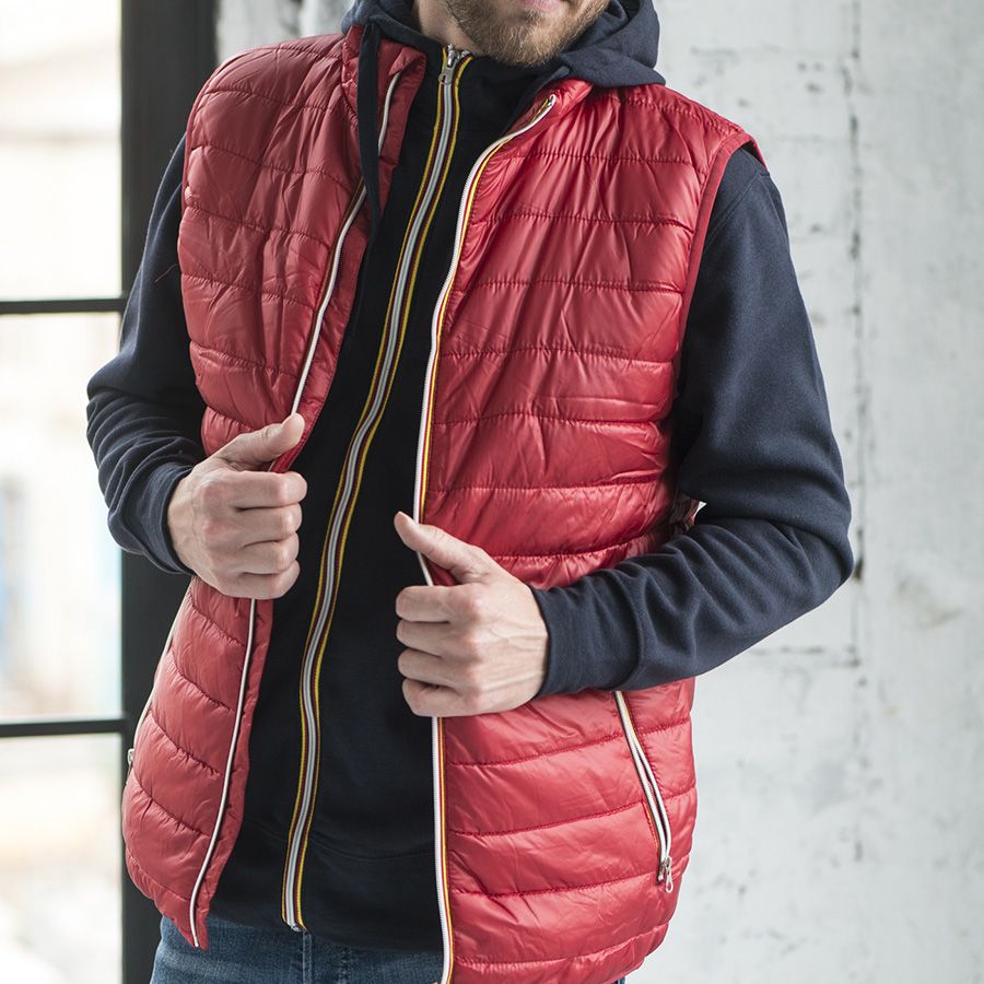 Легкий жилет из нейлона. Небольшой воротник-стойка. Контрастная облегленная пластиковая молния со съемным пуллером. Два передних кармана на молнии. Один внутренний карман на липучке. Cтягивающая эластичная резинка по низу изделия и в рукавах.