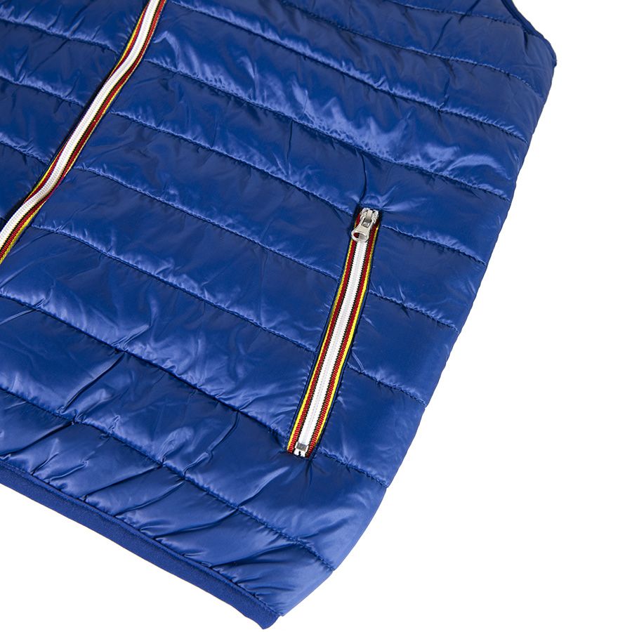 Основная ткань: цвет, близкий к Pantone 539 U, подкладка: цвет, близкий к Pantone 430 C Легкий жилет из нейлона. Небольшой воротник-стойка. Контрастная облегленная пластиковая молния со съемным пуллером. Два передних кармана на молнии. Один внутренний карман на липучке. Cтягивающая эластичная резинка по низу изделия и в рукавах.