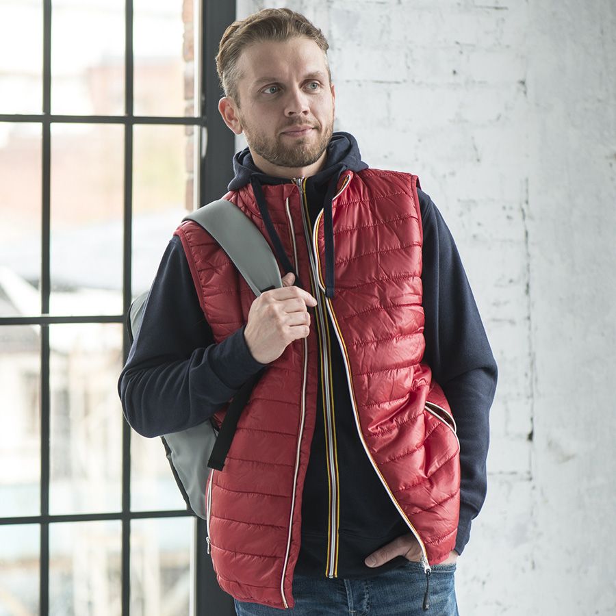 Основная ткань: цвет, близкий к Pantone 539 U, подкладка: цвет, близкий к Pantone 430 C Легкий жилет из нейлона. Небольшой воротник-стойка. Контрастная облегленная пластиковая молния со съемным пуллером. Два передних кармана на молнии. Один внутренний карман на липучке. Cтягивающая эластичная резинка по низу изделия и в рукавах.