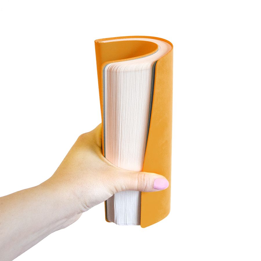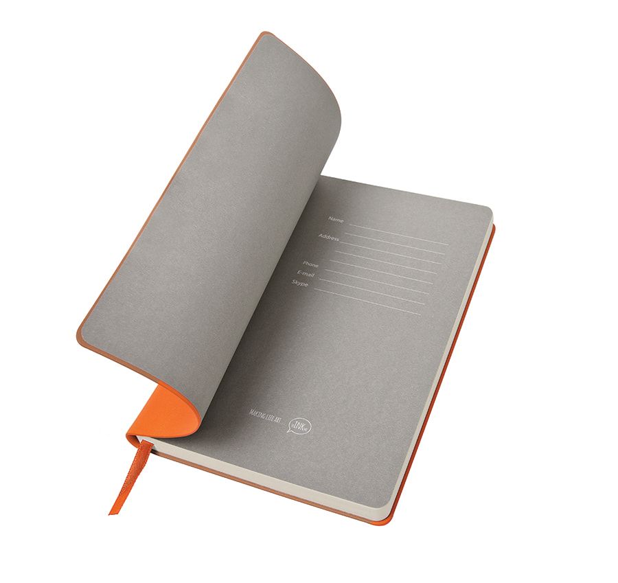 Блокнот с мягкой термоактивной обложкой и популярной комбинацией цветов Термоактивный PU материал Velvet Цвет обложки, близкий к Pantone 158C Цвет форзаца, близкий к Pantone Cool Gray 5U Внутренний блок 256 страниц в линейку Идеально скругленные углы блока Перфорированные 8 последних листов Кремовая FSC бумага 70 г м2 Ляссе в тон обложки Индивидуальная упаковка: фирменный сливбокс thINKme