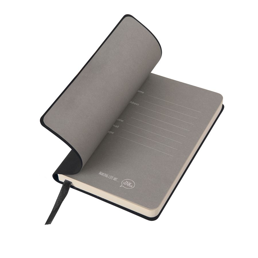 Блокнот с мягкой термоактивной обложкой и популярной комбинацией цветов Термоактивный PU материал Velvet Цвет обложки, близкий к Pantone BlackС Цвет форзаца, близкий к Pantone Cool Gray 5U Внутренний блок 192 страницы в клетку Идеально скругленные углы блока Перфорированные 8 последних листов Кремовая FSC бумага 70 г м2 Ляссе в тон обложки Фирменный сливбокс thINKme