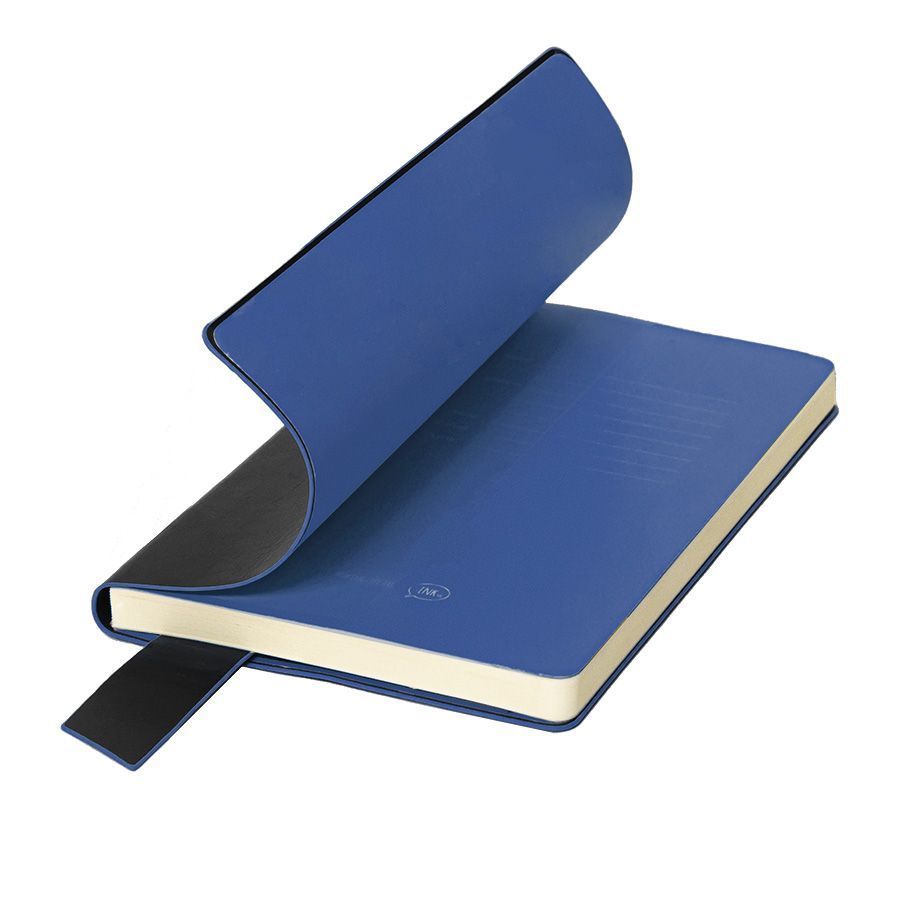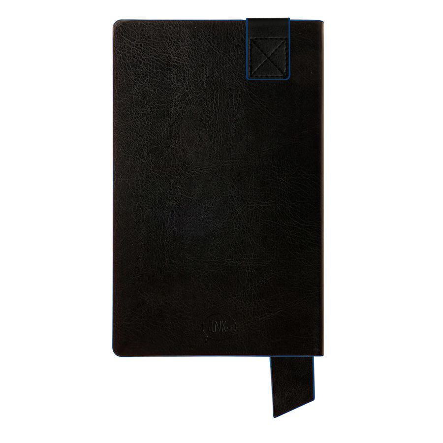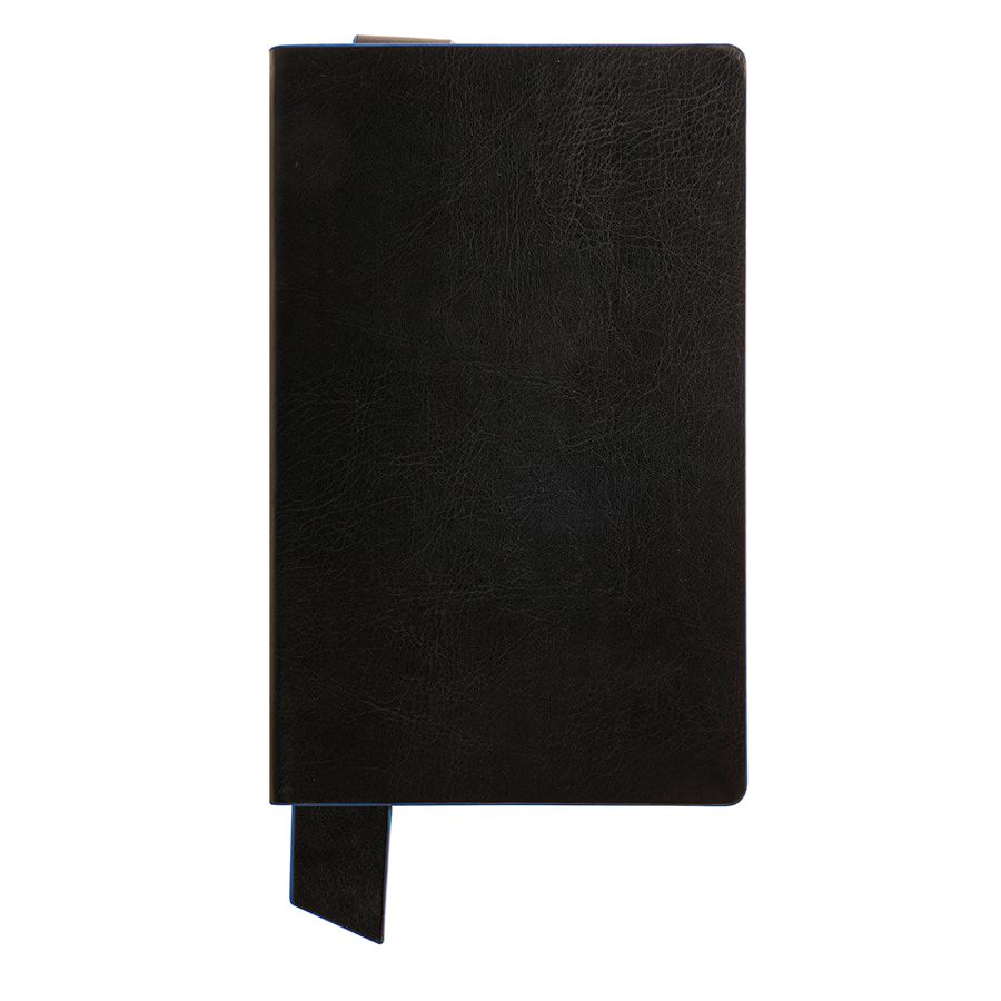 Размер блокнота 130*210 мм. Имитирующая натуральную кожу мягкая PU обложка Bondy черного цвета по краям имеет яркую цветовую отделку. Широкая закладка из аналогичного PU также контрастно окрашена по краям. Форзац и нахзац в тон цветному канту обложки. Цвет форзаца нахзаца и отделки обложки близок к pantone 301C. Внутренний блок 256 страниц в линейку. Идеально скругленные углы блока. Перфорированные 8 последних листов. Кремовая eco-friendly FSC бумага 70 г м2. Карман для записок в тон нахзаца.