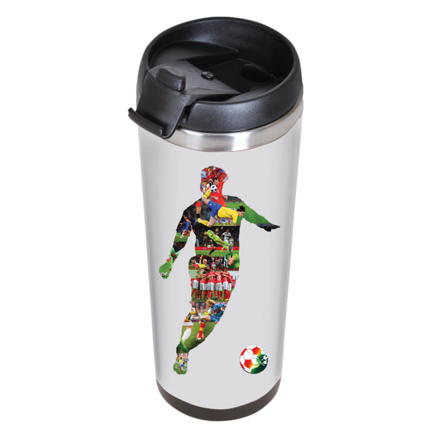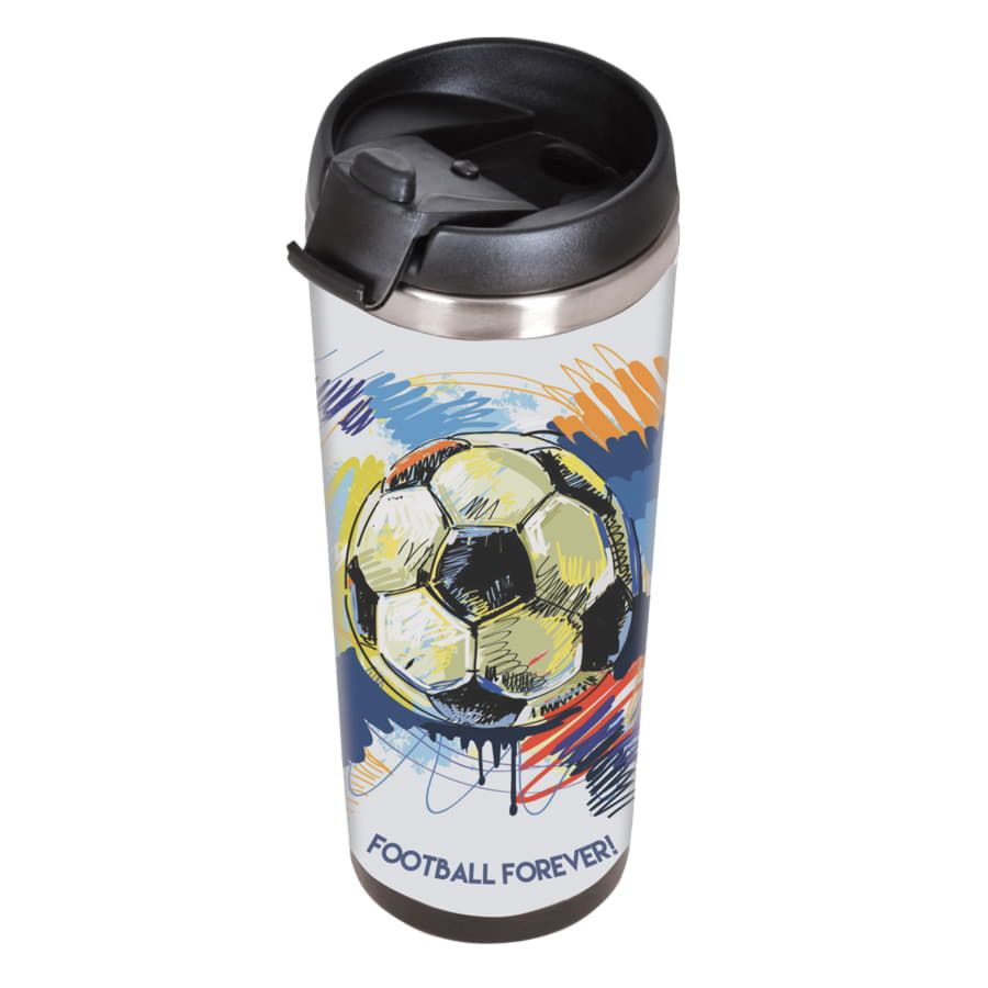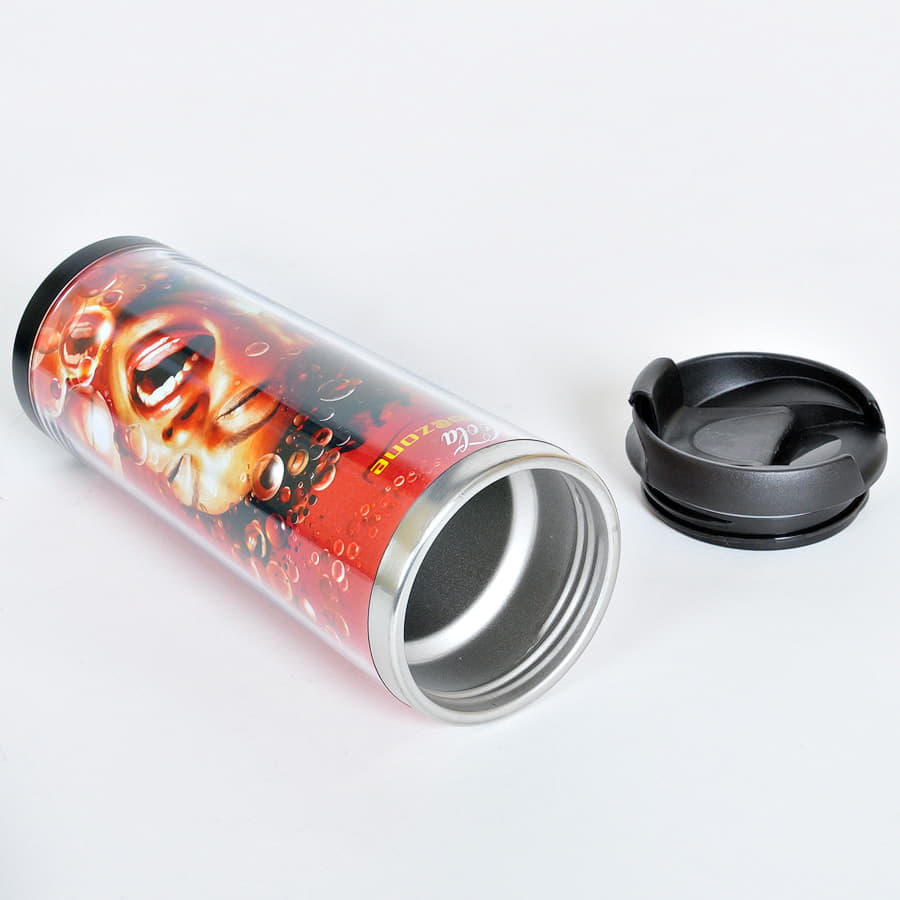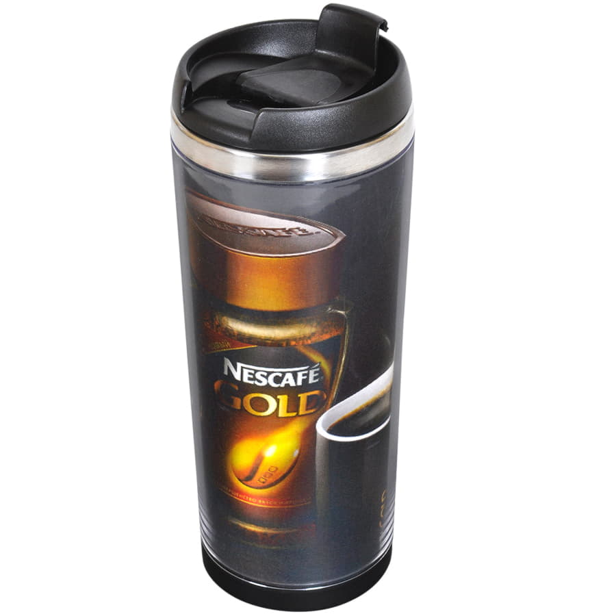 Термокружка с колбой из нержавеющей стали с огромным полем для печати, на котором можно разместить не просто логотип, а целый буклет. Полноцветная вставка занимает всю поверхность стакана и смотрится очень органично. Для сборки и разборки не требуются клей или специальные инструменты - изображение помещают в пространство между внешним и внутренним слоями корпуса. Хранит тепло 2-3 часа.